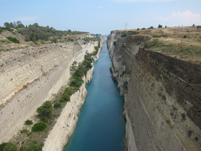 In early June I had the chance to visit the Corinth Canal with Sophia Loverdou, the woman who has launched a campaign to save the ancient diolkos (more on that campaign later in the week). As I wrote in this post in late June, she and I toured the part of the diolkos inside Military Engineers Camp. We also drove along the dirt road on the Peloponnesian side of the canal (visible just above the cliff face in the image below) and viewed the canal from various perspectives.