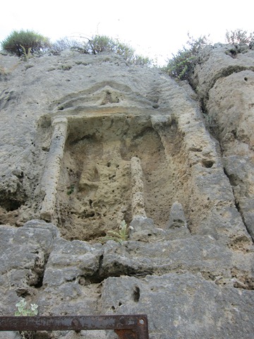 A comparison of these to Wiseman’s Land of the Ancient Corinthians, fig. 46, suggests that the stone has deteriorated significantly since he shot his photo in the 1960s. And of course, the sprayed black tagging shown on the rock face below is new.