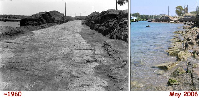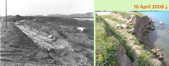 It’s not hard to construct narratives of decline for the paved trans-Isthmus diolkos road. One only has to compare the monument unearthed by N. Verdelis 50 years ago with modern photos of a road sliding into the canal. Indeed, Sophia Loverdou has used the tools of social media to launch a “Save the Diolkos” campaign. She has documented the deterioration of the road by posting dozens of “before” and “after” images of the road since its excavation (see this Facebook page), and marked the ongoing consequences of continuous canal traffic through this Youtube channel.