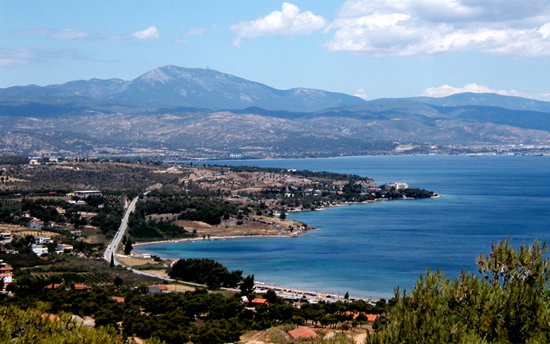 Photo of Kenchreai harbor, the Koutsongila ridge, and Saronic coastline from Stanatopi