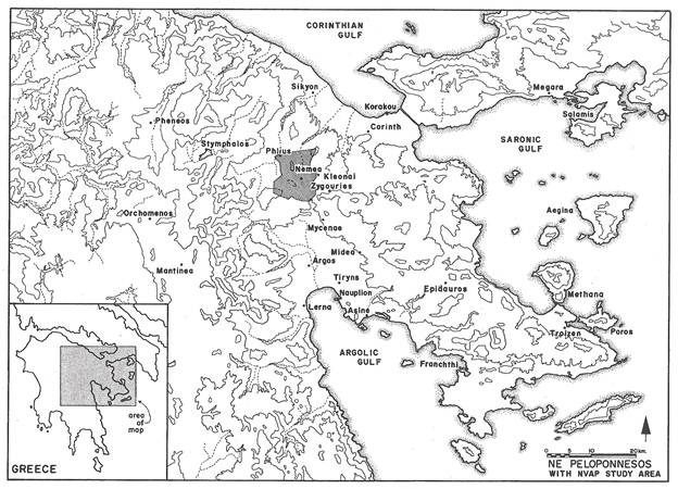 Map courtesy of the Nemea Valley Archaeological Project. Drawing by Julia E. Pfaff, reprinted from page 581 of Wright et al., “The Nemea Valley Archaeological Project: a Preliminary Report,” Hesperia 59 (4):579-659.