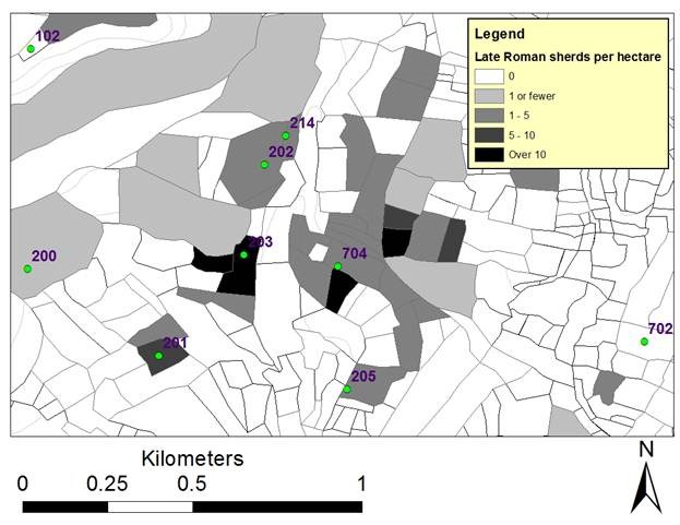 Densities of sherds declining with distance from NVAP’s site 704, a small Late Roman villa (C. Cloke)