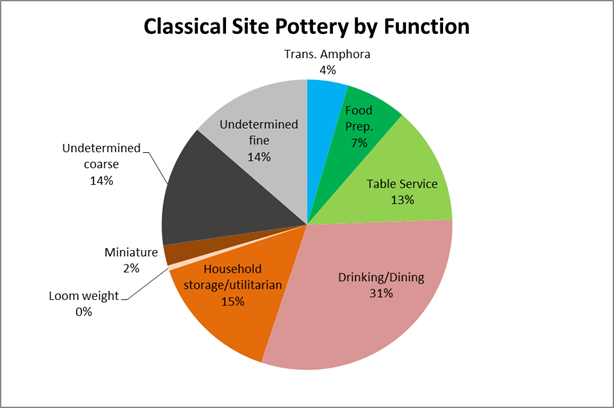 A fuller picture begins to emerge when we look at the functional classes of pottery making up these assemblages. For the Classical period, as well as the Archaic and Hellenistic periods preceding and following, there is a clear and consistent functional shift between on-site and off-site ceramic finds: