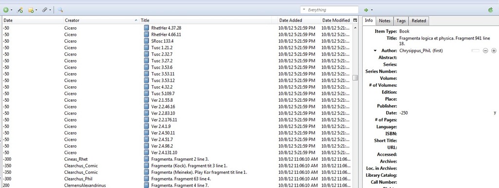 Creating a library of ancient citations was challenging. It took much experimentation to figure out how to convert a list of ancient citations into a standardized tab-delimited file that could convert into bibliographic entries in EndNote and then into Zotero. But I was eventually triumphant and now have a collection of about 5,800 references to Greek and Latin texts between the 8th century BC and 7th century AD. I’ll take notes on some of the texts this year and write a bit more about how to run the conversions. Here is what a small part of the library looks like: