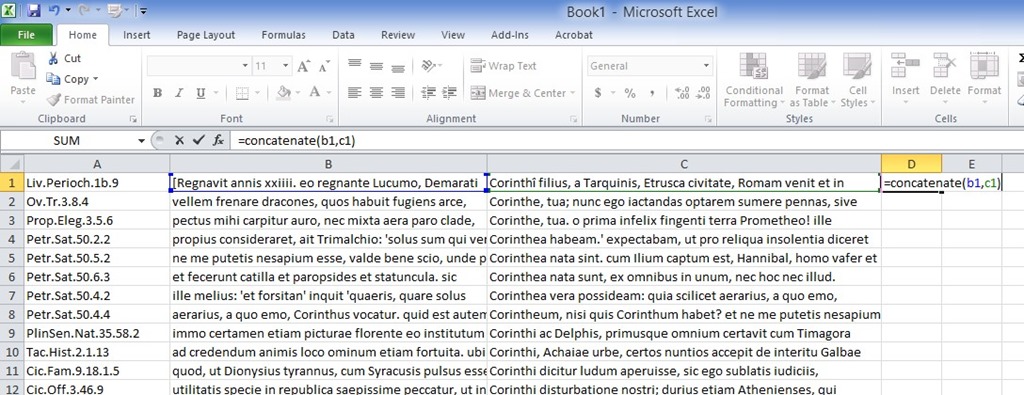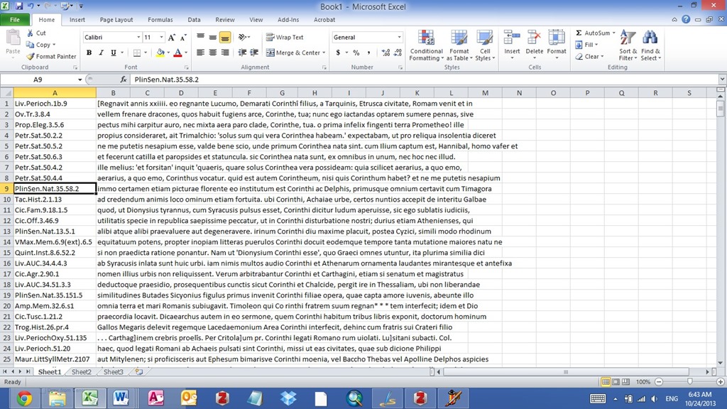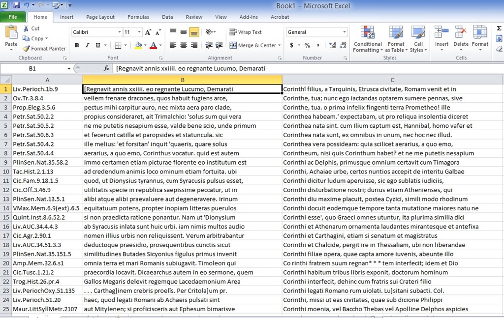 Excel divides the copied text into three columns, incorrectly deducing a break at the bold word “Corinth”. You’ll need to convert the texts in two ways now: separate author and work-citation from one another via commas, and combine the two columns into a single text using the Concatenate function of Excel (I’m assuming you will want to keep the Latin text).