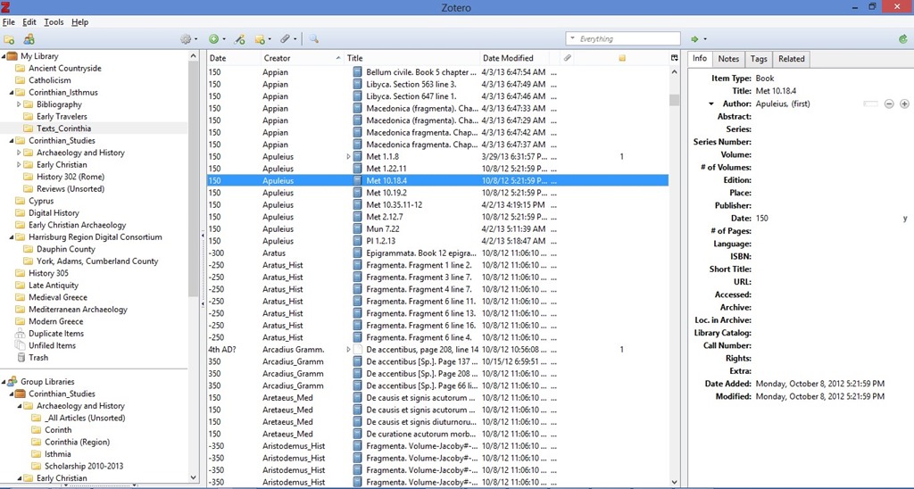 Last year, I became interested in how to use freeware like Zotero (or commercial software like EndNote) to organize, tag, and annotate large bodies of ancient literary sources. My ambitious plan was to look up and analyze all the Greek and Latin references to isthmuses in antiquity, and I needed a better system for organizing my findings and translations than word processing software. I was particularly interested in creating a large body of English translations that would facilitate complex word searches. I was also interested in creating a library of Corinthia-related texts that would serve the public.