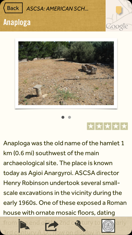 What makes this seventh edition of the guidebook particularly interesting is that the ASCSA partnered with Google to make much (all?) of the content of the guide available for free via Google’s Field Trip app (which you can download here for iPhone and here for Android). In fact, given the partnership with Google, the app enhances and even changes the reader’s experience of the tour. As their press release notes, “You will be notified by your device’s GPS when you approach any of over 50 Corinth monuments. View images, descriptions, links to more information on ascsa.net, and related Hesperia articles. Field Trip frees you to tour Ancient Corinth however you like in whatever direction you choose.” In other words, you can jump in and out of tour from anywhere on site and are not constrained by the linear presentation that the physical guidebook assumes. All you need is a phone and connection.
