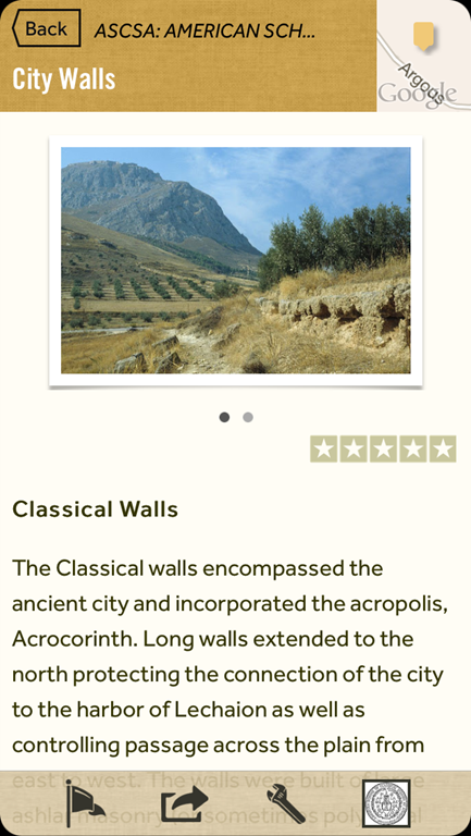 These foibles aside, there’s still much to gain from a virtual field trip. There are dozens of cards with up-to-date information and scores of beautiful high-quality color and B&W photos. In their brevity, the cards oversimplify the debates over particular places in the Corinthian landscape, but they do hint at the scholarly controversies. I was glad, for example, to see in the discussion of the fortification walls of Corinth the two hypotheses about the date of the Late Roman wall, the Theodosian and Justinianic. The cards also link to additional information beyond the app, although the external links to bibliography are selective.