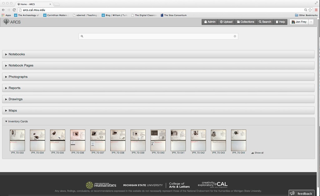 As a result, with colleagues at the MSU College of Arts and Letters Academic Technology Office I began to develop an open source solution that would allow an archaeological project to create a digital workspace where documents could be collected, curated and shared according to an organizational scheme defined by the individual project. With the assistance of an NEH Digital Humanities Startup Grant in 2011, we created the Archaeological Resource Cataloging System (ARCS), which can be accessed at the present moment at http://arcs.cal.msu.edu