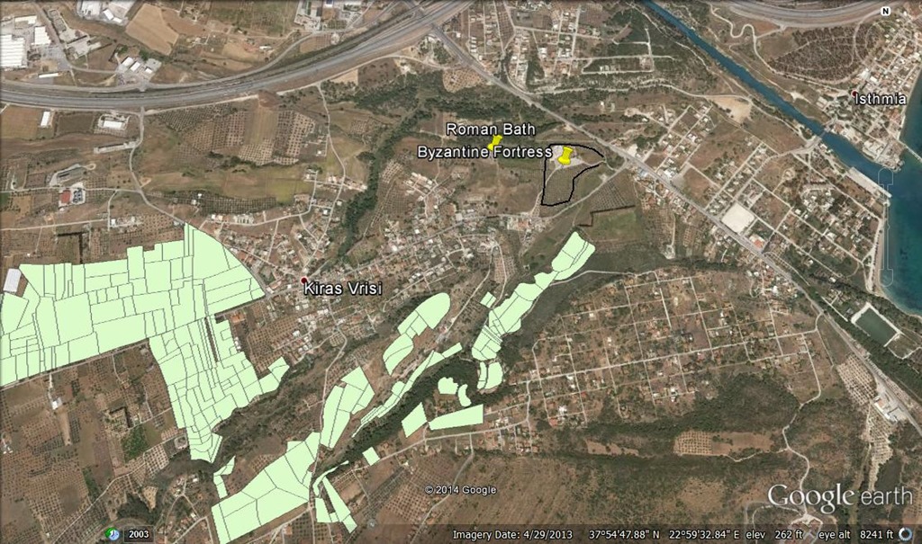 Another view of the proximity of these survey units to Isthmia: the Rman Bath and Bzyantine fortress are clearly labeled.