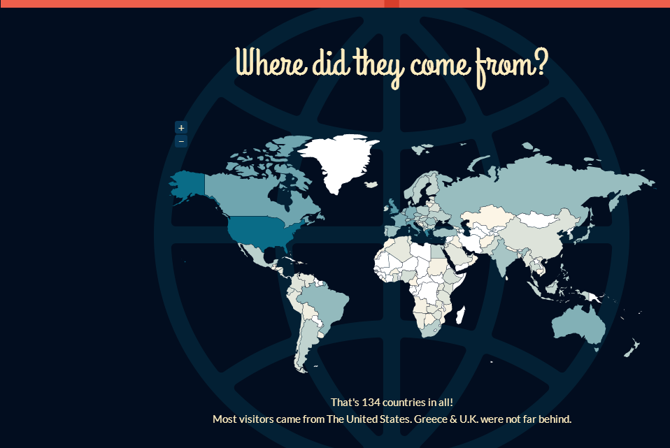 This “global” representation is in some ways misleading in that most of this traffic came from North America and Europe, but still, all the world’s continents except for Antarctica are all represented. As for specific countries, the United States generated the greatest share (38%) with Greece (17%) and the United Kingdom (8%) following. Traffic from South America and southeast Asia was appreciable. Nothing yet from North Korea! The following table lists the top 25 countries that accessed the site in 2014 and the volume of traffic generated.