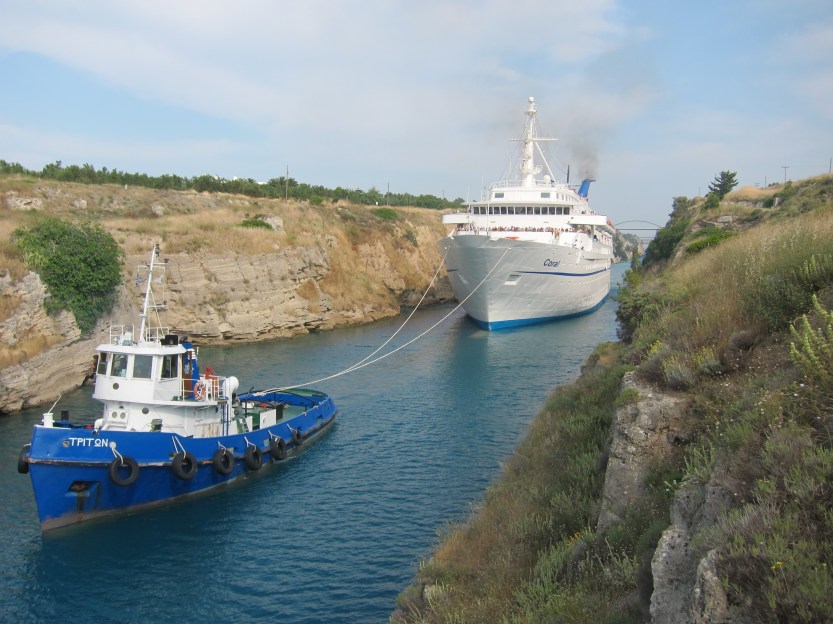 The hopes of 19th century engineers that the Corinth Canal would become a major seaway for traffic from the Adriatic were frustrated by the growing size of seafaring ships from the early 20th century. This cruise boat has a tight squeeze. Photo by David Pettegrew, June 2, 2011.Photo by David Pettegrew, June 2, 2011.