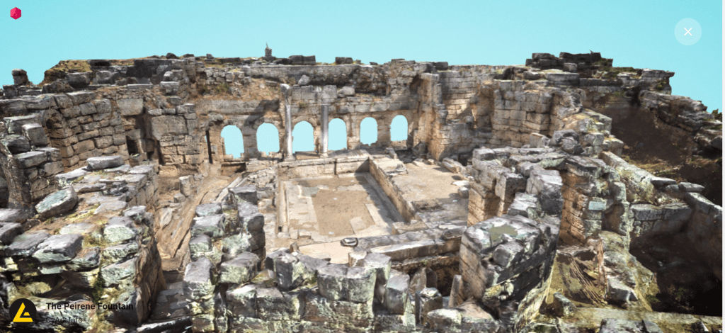 Then go on to explore the interactive map that allows any viewer to drop the little yellow street view figure onto any of the photogrammetry points. Voila — anyone can actually move within the Fountain of Peirene for the first time in decades. You can also explore 3D models of the Temple of Apollo and Peirene Fountain.
