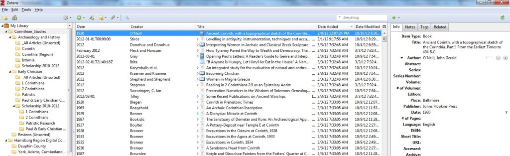 The library is divided into four main collections : Archaeology and History, Christianity & Judaism, Geology, and Religion, and tagged accordingly (.ARCHAEOLOGY AND HISTORY, .CHRISTIANITY & JUDAISM, .GEOLOGY, .RELIGION). These show up in the Tags area to the lower left of the Zotero Library. An item may belong to both categories in the case of – for example — archaeological and historical scholarship that is directed to or clearly relevant to New Testament studies, or New Testament scholarship that informs the history and archaeology of Corinth.