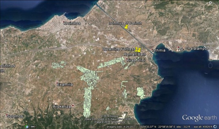 The Eastern Korinthia Archaeological Survey was an intensive survey on the Corinthian Isthmus–one of the busiest and richest archaeological regions in all of Greece–directed by Timothy Gregory (The Ohio State University) and Daniel Pullen (Florida State Unviersity), with the support of Thomas Tartaron (field director) and other field archaeologists and specialists. The project carried out most of its work in the area between the village of Hexamilia, the Panhellenic Sanctuary of Poseidon at Isthmia, and the ancient harbor town at Kenchreai, but survey work was also undertaken in a few select parts of the southeastern territory. The project grew out of previous investigations in the eastern territory and led to a number of substantial subsequent archaeological investigations: the cemetery on the Koutsongila Ridge near Kenchreai (Kenchreai Cemetery Project), the Saronic Harbors Archaeological Research Project, rural sites such as Kato Vayia and Ano Vayia, and the modern semi-abandoned village at Lakka Skoutara.