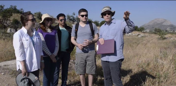 Field team surveys stubble field on Isthmus with Acrocorinth looming