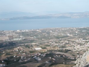 The excavated forum is visible to the right, Lechaion harbor to the north, and the Perachora peninsula in the upper part.