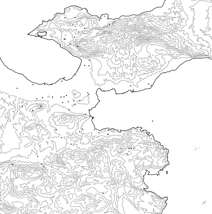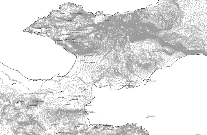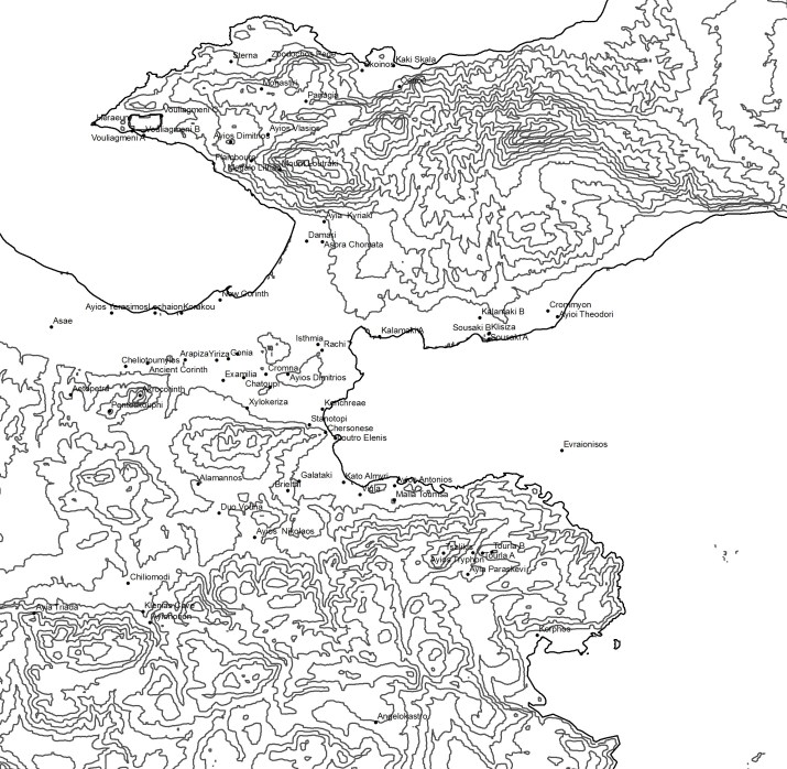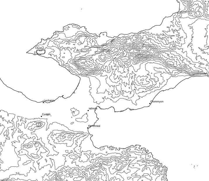The images below display the extent of the contours made available here. The first shows the extent of contour coverage for southern and central Greece, the second for the modern regional unit of the Corinthia (and western Attica), which includes the ancient territories of Corinth, Sikyon, Tenea, and Megara.