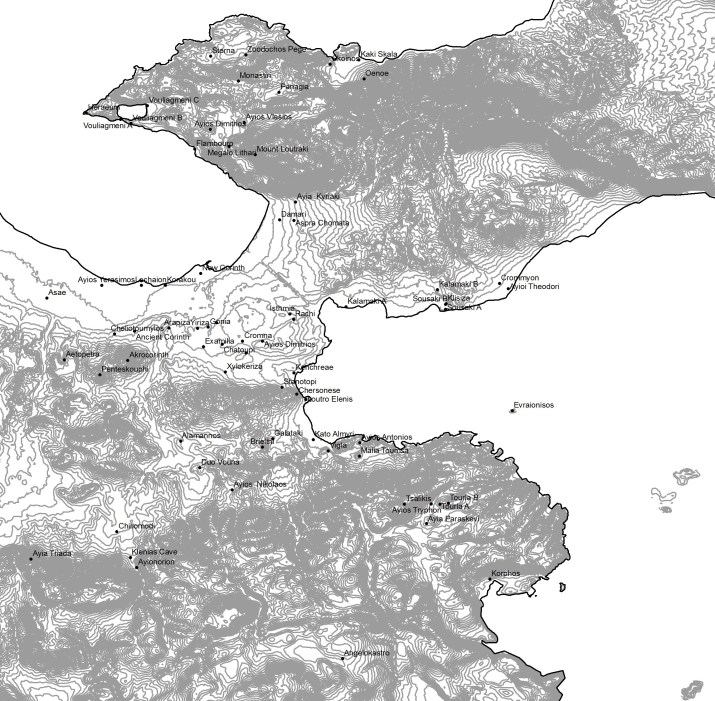 Corinthia, with major ancient sites (20 m contours, SRTM data)