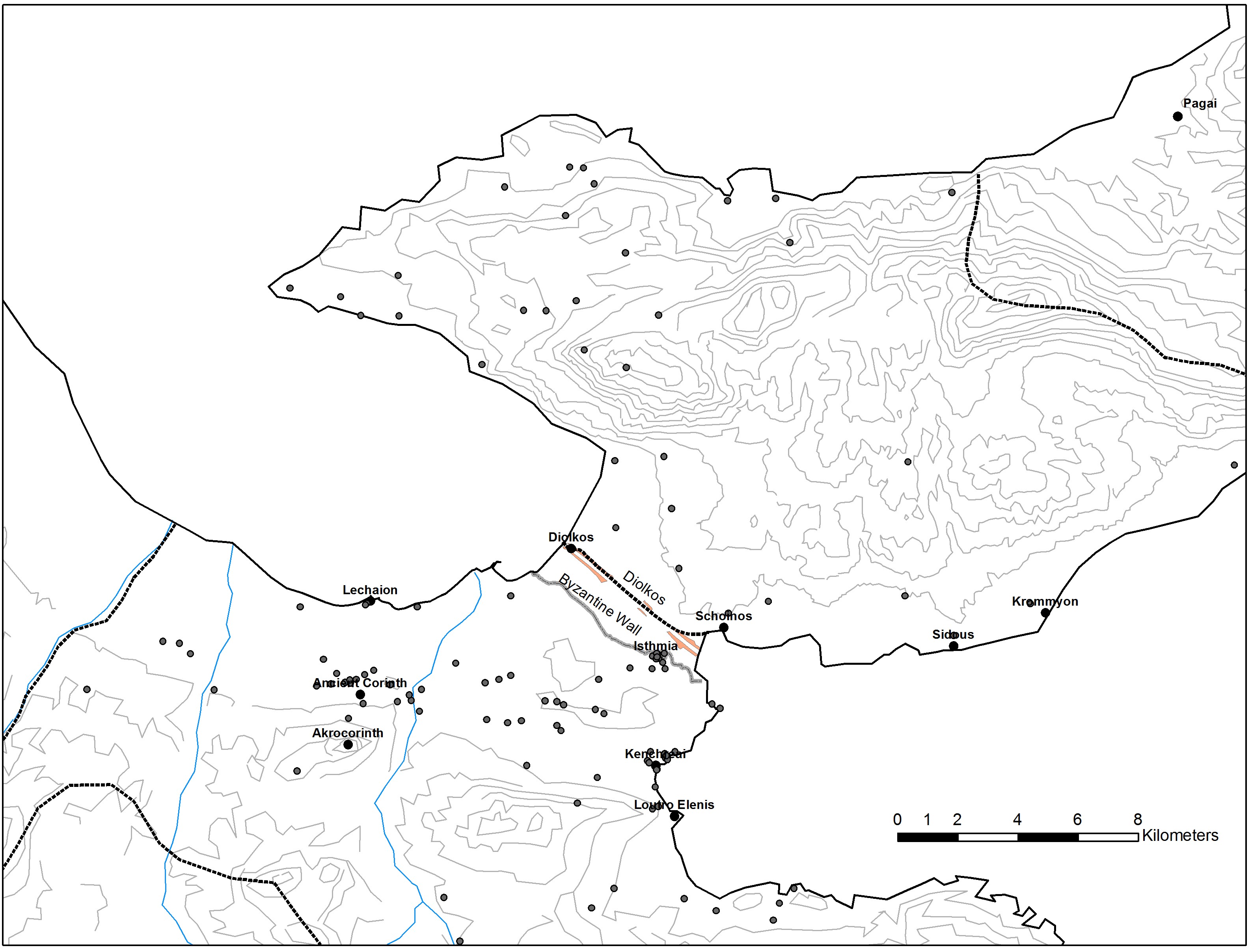 Ancient and Modern Corinthian Sites (100 m contours, SRTM data)