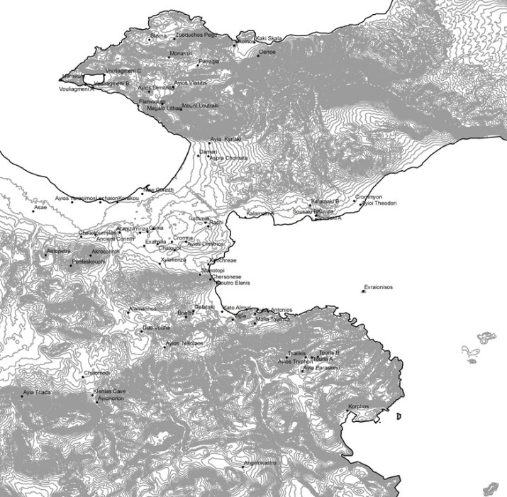 Corinthia, with major ancient sites (100 m contours, SRTM data)
